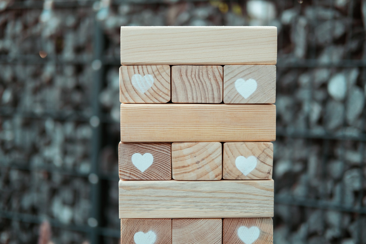 Das Jenga besteht aus 58 Holzklötzen, die zu Beginn des Spiels einen 90 cm hohen Turm bildet. Hierfür werden die Holzsteine mit jeweils 3 Steinen pro Schicht rechtwinklig zueinander aufgebaut. Jeder Spieler muss abwechselnd einen Stein aus einer beliebigen Schicht des Turmes herausziehen und dann ganz oben wieder auflegen bis es am Ende nicht mehr stabil ist und umkippt.